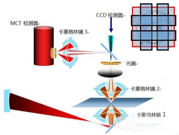 紅外光先從光源到達卡塞格林鏡1,該鏡為聚焦鏡,將光束聚焦,經(jīng)過樣品,到達卡塞格林鏡2,即物鏡上,在此光路圖中,最重要的卡塞格林鏡為3號鏡,即到達檢測器前,將紅外光譜的信號再次聚焦,保證能量最大。